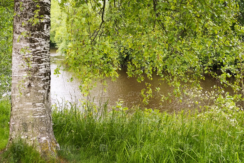 Летний пейзаж с березой и ручьем после дождя