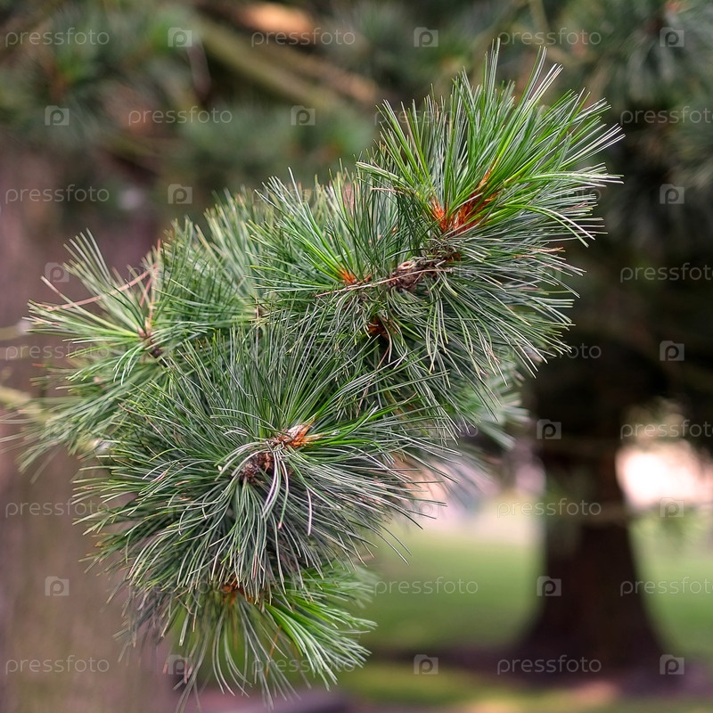 Зеленая ветка хвойного дерева с разным фокусом на летний день в парке