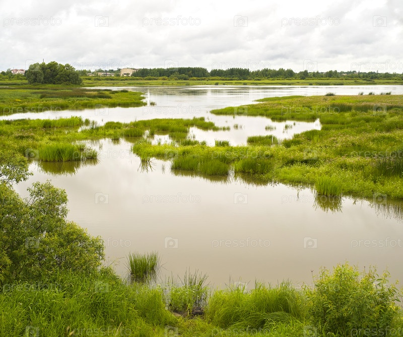 Летний пейзаж с равнинной рекой после дождя