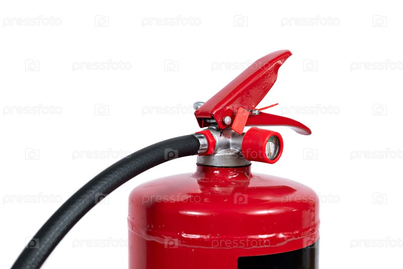 Красный цилиндрический огнетушитель с черным шлангом, контрастирующий с белым фоном. Огнетушитель содержит сжатый газ и обычно используется в офисных принадлежностях для тушения пожаров