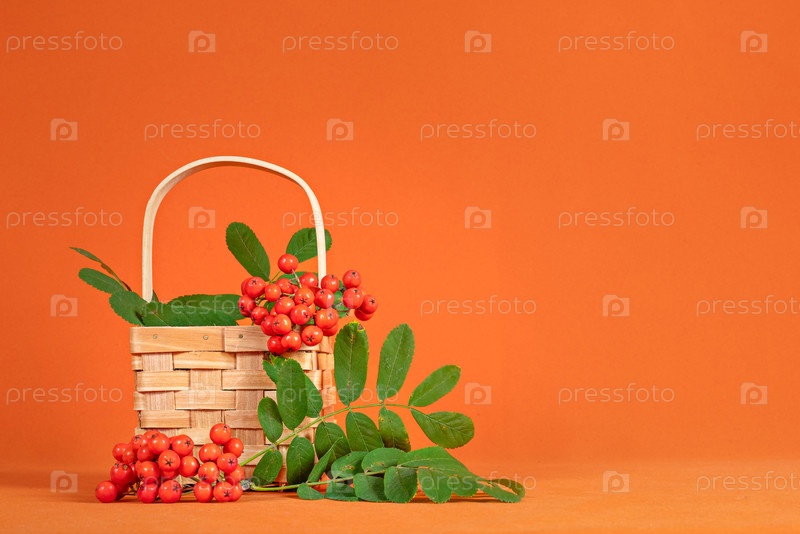 Яркие ягоды рябины рассыпаются на ярком оранжевом фоне — эффектное и жизнерадостное изображение, идеально подходящее для осенней тематики, естественного оздоровления или для иллюстрации чувства изобилия и жизненной силы