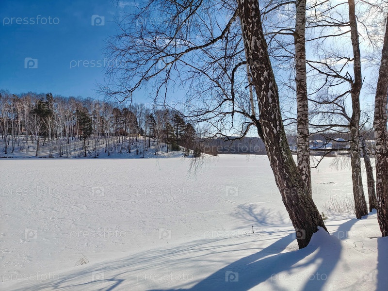 Зимнее озеро под снегом в солнечный день