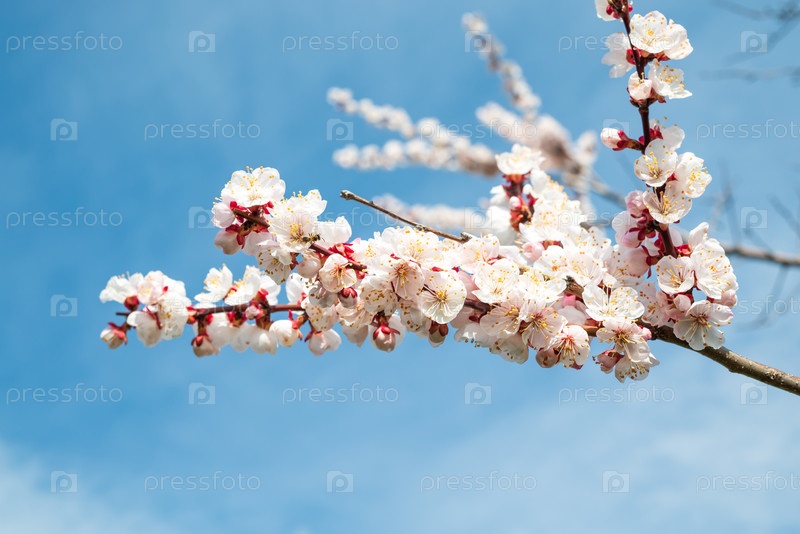 Макрофотография цветущей ветки абрикосового дерева весной на фоне голубого неба