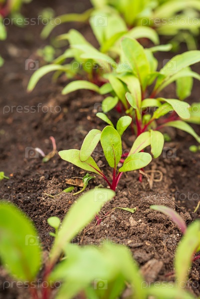 Рассада свеклы с огородом. Растения свеклы рядами на высоких грядках весной