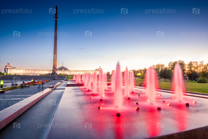 Вечерний вид на фонтаны Монумента Победы на Поклонной горе в Москве. Россия