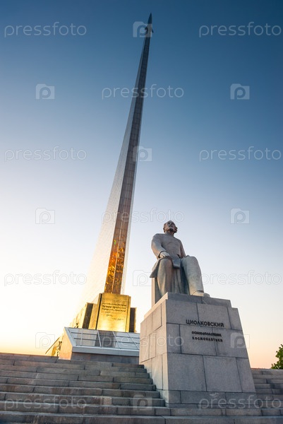 Памятник Циолковскому на фоне Монумента Покорителям космоса Музей космонавтики в Москве вечером. Россия
