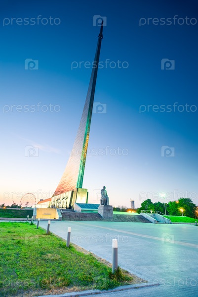 Эпический Памятник покорителям космоса — Музей космонавтики в Москве вечером. Россия