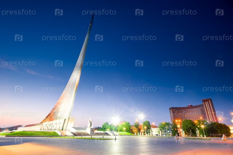 Эпический Памятник покорителям космоса — Музей космонавтики в Москве вечером. Россия