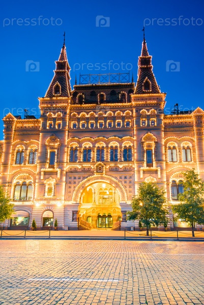 Вечерний вид на знаменитое историческое здание ГУМа на Красной площади Московского Кремля. Россия