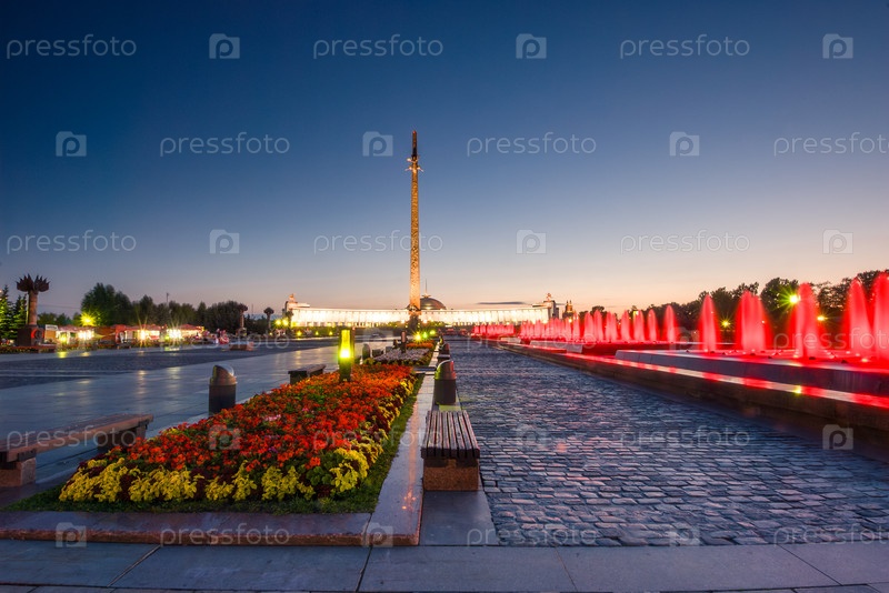 Вечерний вид на фонтаны Монумента Победы на Поклонной горе в Москве. Россия