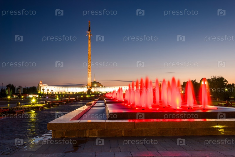 Вечерний вид на фонтаны Монумента Победы на Поклонной горе в Москве. Россия