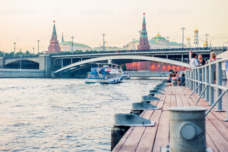 Живописный вечерний вид на Московский Кремль с причала Красный Октябрь на Москве-реке. Россия