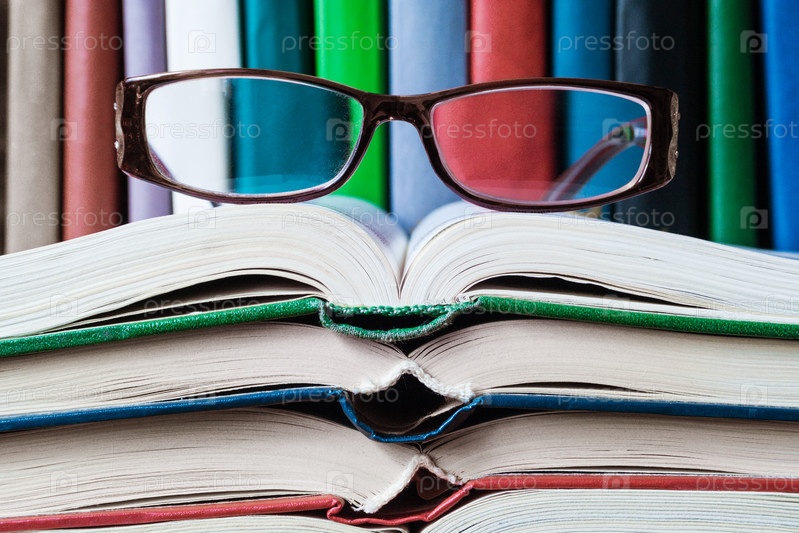 На раскрытых книгах лежат очки (концепция)