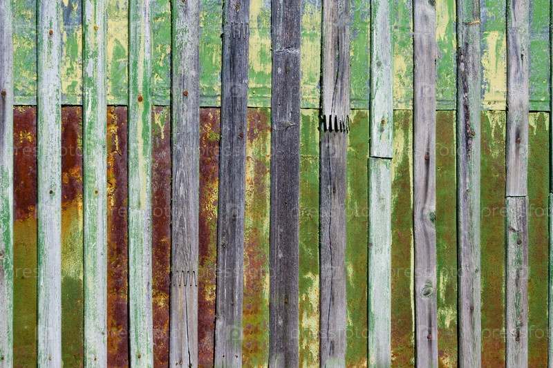 Старые окрашенные деревянные доски на ржавой металлической поверхности (фон, текстура)