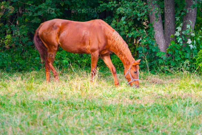Коричневый конь ест траву на фоне зеленых деревьев