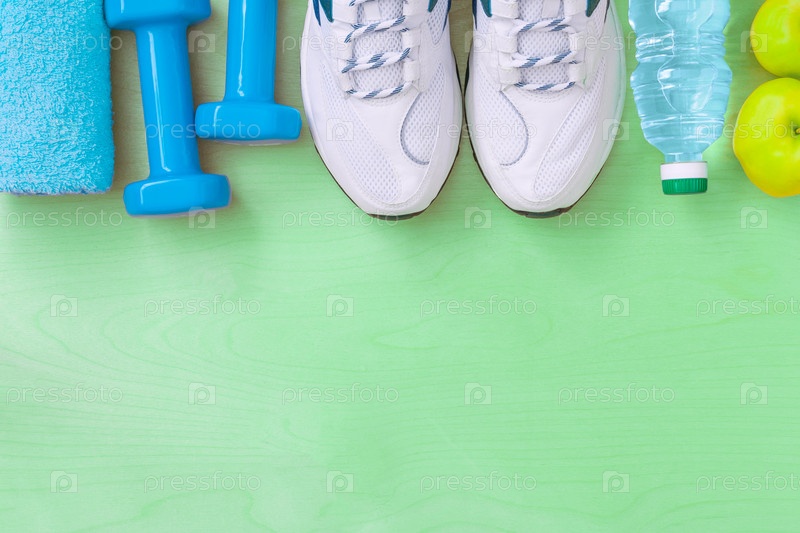 Атрибуты здорового образа жизни: вода, яблоки, спортивный инвентарь на ярко-зеленой поверхности. Плоский вид с копировальным пространством