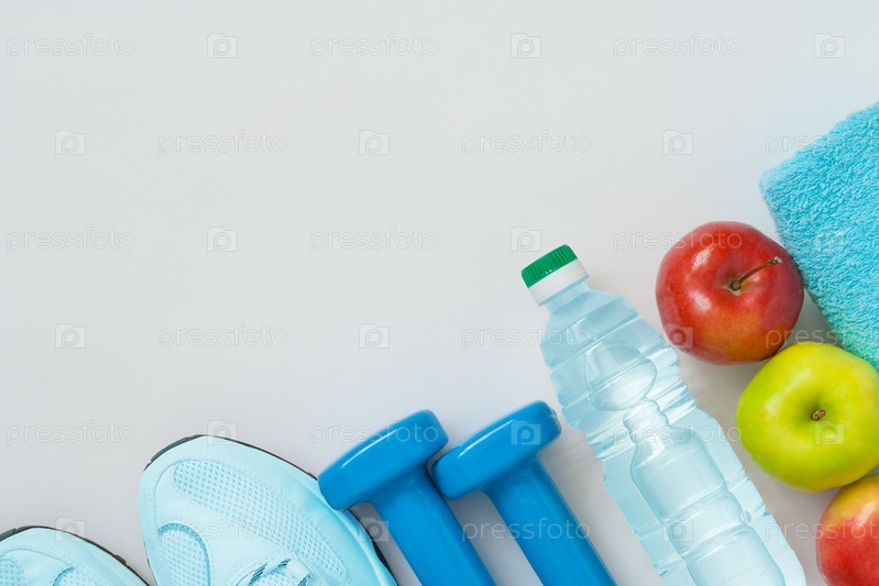 Атрибуты здорового образа жизни: еда, спорт или инвентарь спортсмена на ярком фоне. Плоский вид с копировальным пространством