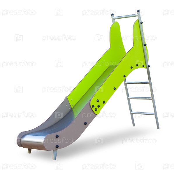 Детская горка из металла и пластика, окрашенная в нежно-зеленый цвет с тенью, изолированная на белом фоне (элемент дизайна)