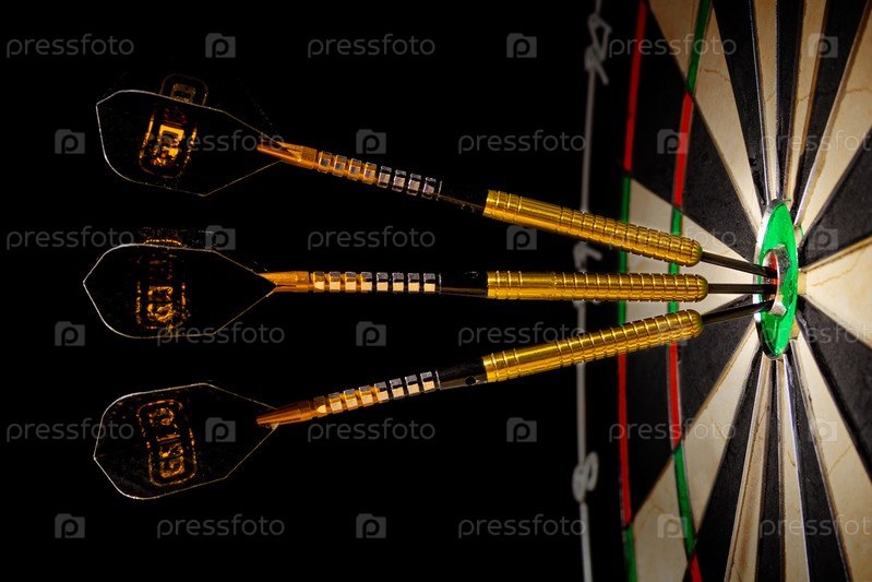 Мишень из сизаля с тремя дротиками в центре мишени на черном фоне