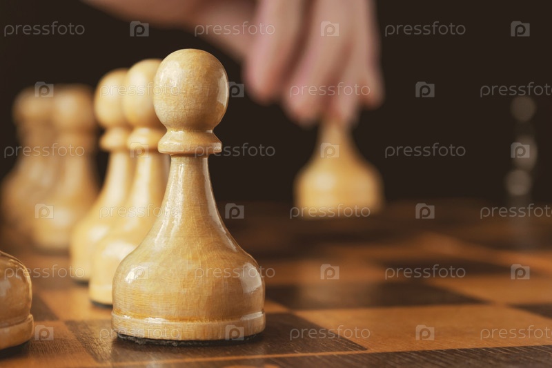 Рука шахматиста делает ход белой пешкой вперед, не в фокусе, пешка на переднем плане в фокусе