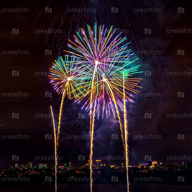 Красивый красочный фейерверк на фоне темного неба и огней ночного города