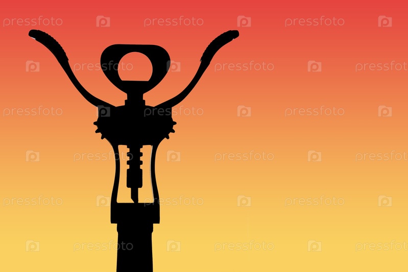 Абстрактный вид темного силуэта фрагмента бутылки вина со штопором на фоне красно-оранжевой градиентной подсветки (пространство для копирования)