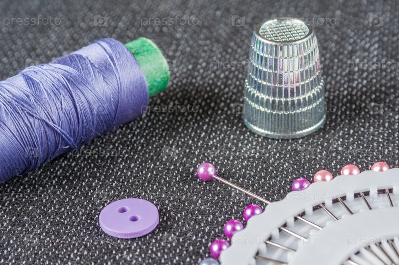 Швейные принадлежности: фиолетовая катушка ниток, иголки, наперсток, пуговица на фактурной поверхности ткани