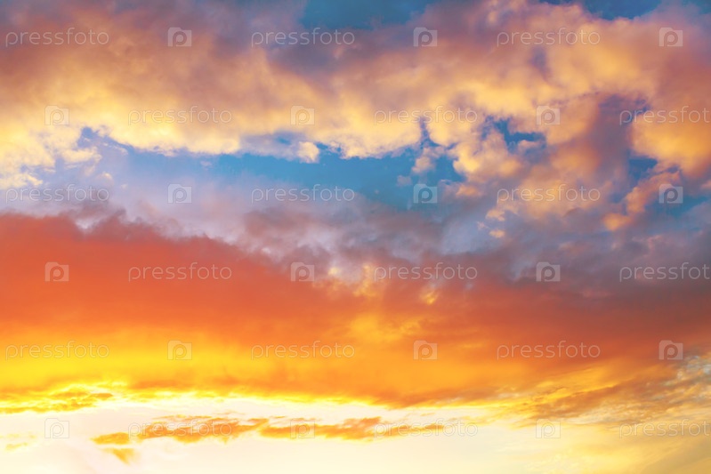 Красивый драматический вид на золотистые пушистые облака, освещенные закатом на фоне голубого неба (фон)