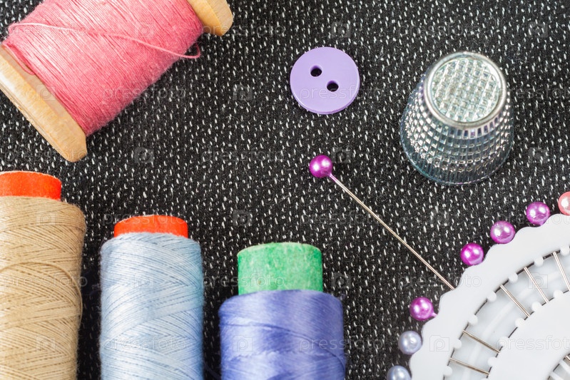Швейные принадлежности: катушки ниток, иголки, наперсток, пуговица на фактурной поверхности ткани (плоский вид)