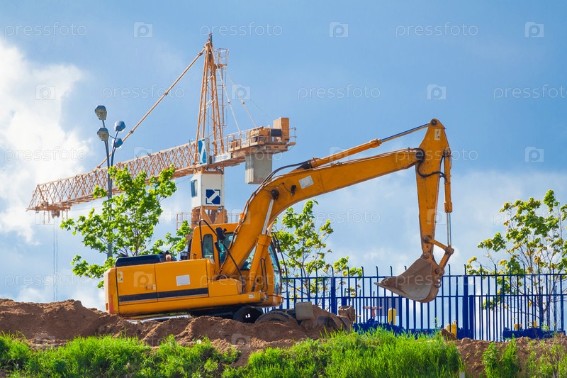 Экскаватор и башенный кран на строительной площадке