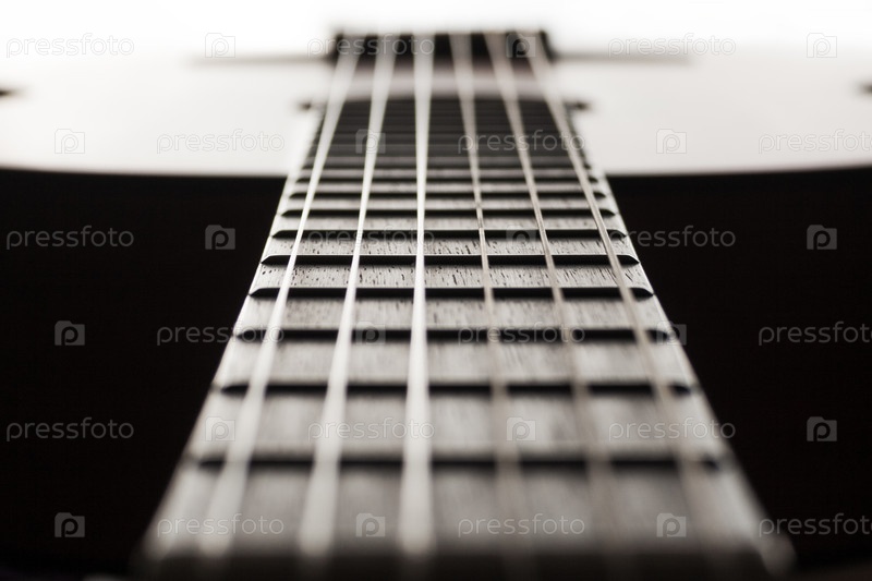 Гриф классической гитары крупным планом с малой глубиной резкости (абстракция, контраст)