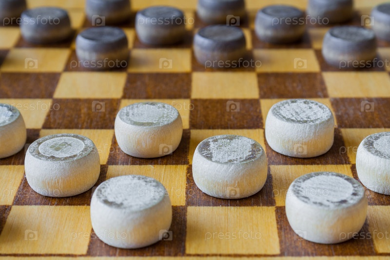 Деревянная шахматная доска с шашками, расставленными на столе (крупный план)