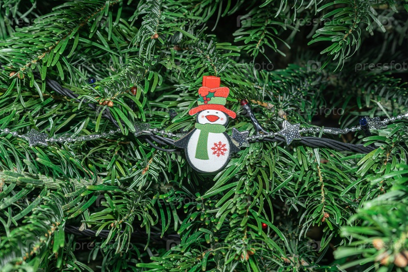 Украшенная рождественская елка со снеговиком и огнями на ветках