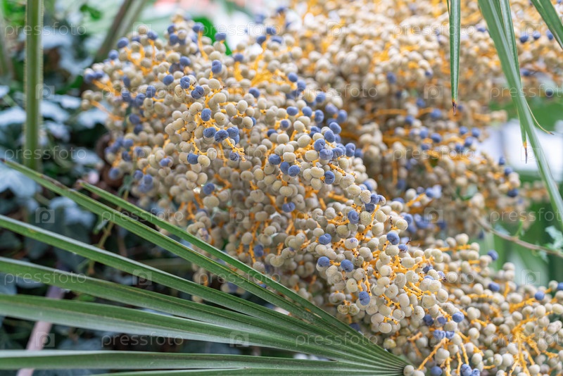 Яркие гроздья цветов на пальме в тропическом саду при дневном свете