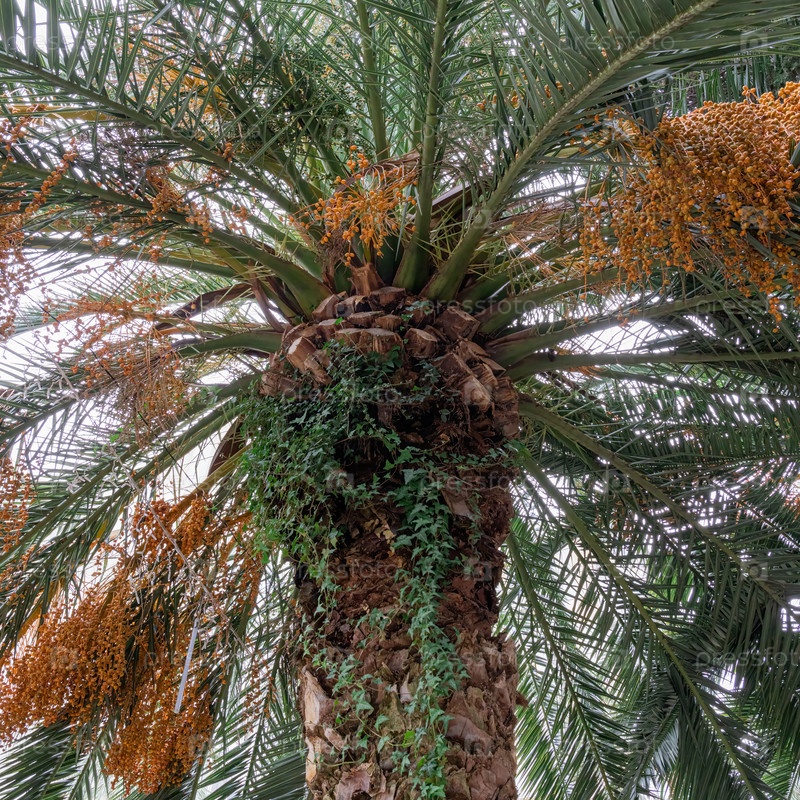 Пальма со спелыми финиками и пышными зелеными листьями в солнечном саду