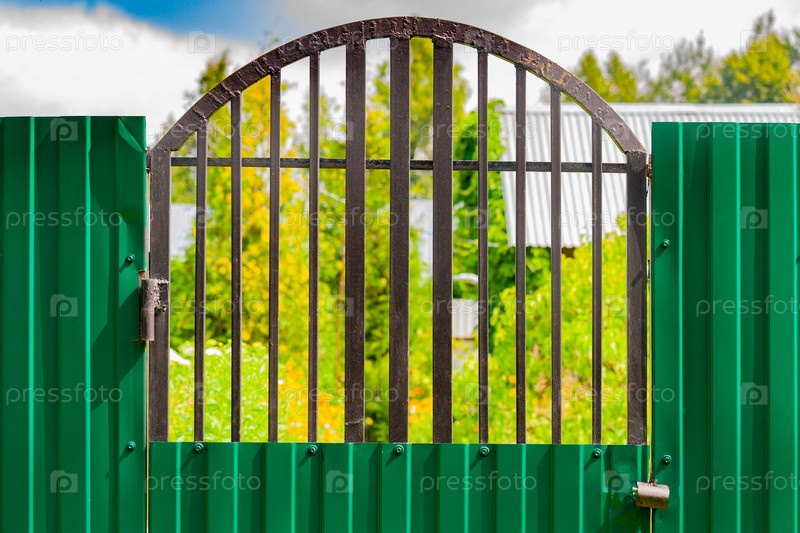 Фрагмент металлических решетчатых ворот на фоне зеленых деревьев