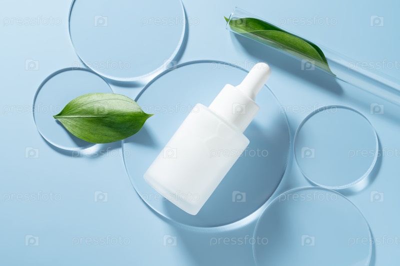 Органический косметический продукт, натуральный ингредиент и лабораторные блюда на синем фоне, вид сверху