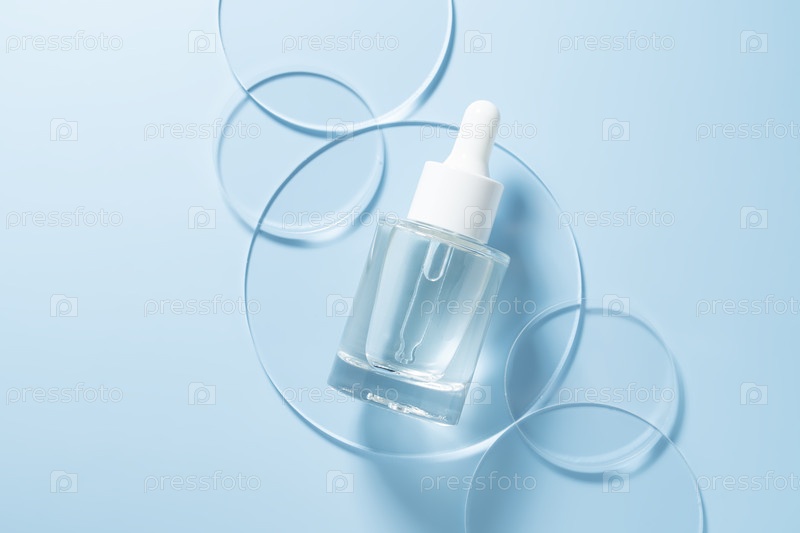 Бутылка для капель и чашка Петри с каплями масла.Лабораторные тесты косметики.Концепция красоты волос, самообслуживания и благополучия