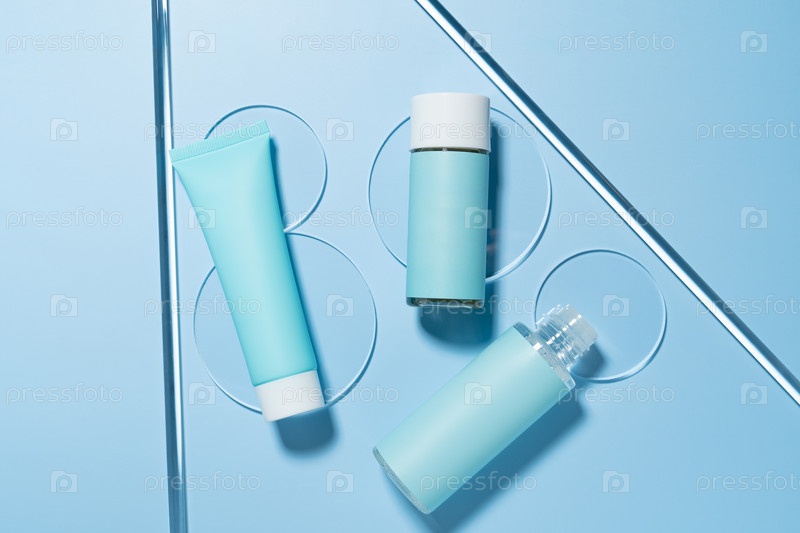 Концепция лаборатории натуральной косметики. чашка Петри с набором косметических упаковок - трубка крема, тонера и бутылки масла на синем фоне. тестирование средств по уходу за кожей