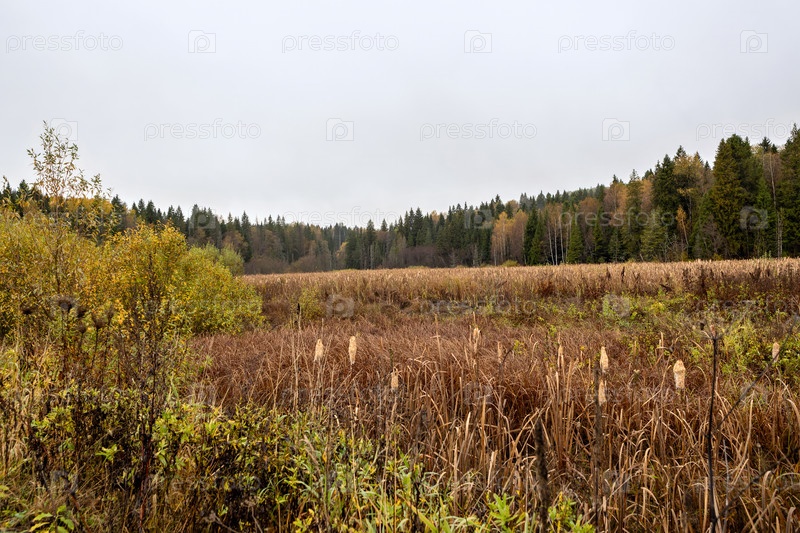 Осенний пейзаж с болотом, сухой травой, лесом и облачным небом на заднем плане