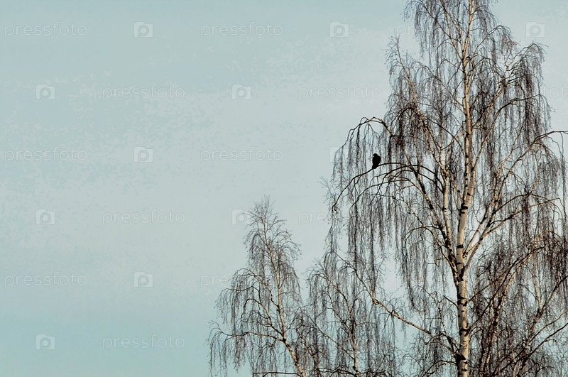 Одинокая ворона сидит на ветке березы