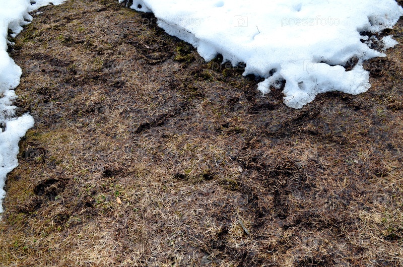 Поврежденный мышами газон зимой