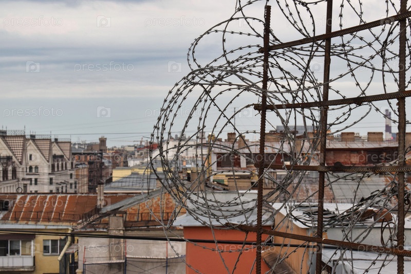 Колючая проволока на фоне крыш города Петра
