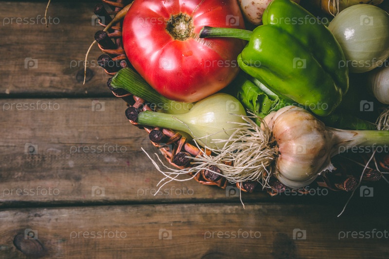 Томат, лук, картофель, перец, чеснок, морковь и свекла. Овощи в корзине на деревянном сельском столе. Копирование пространства. Здоровая еда
