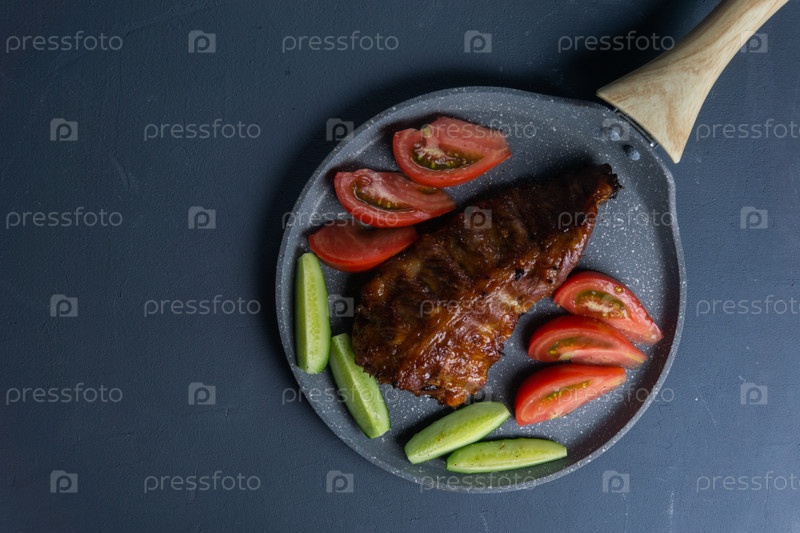 Выпеченные ребра свинины с медом лежат вместе со свежими нарезанными помидорами и огурцами на темно-сером бетонном столешнице