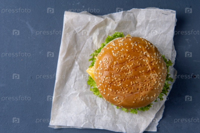 Бургер с говяжьим мясом, салат, кусок томата и сыра, лук и соус с паприкой в жареной булочке с кунжутом