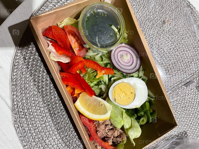 Салат нисуаз в картонном контейнере на плетеной салфетке состоит из следующих ингредиентов: яйца, лука, перца, лимона, тунца и брендового соуса