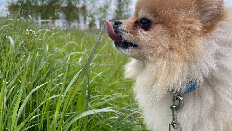 Маленький красный Померанский шпиц на прогулке в голубом воротнике с карабинером лижет язык ярко-зеленой высокой травы
