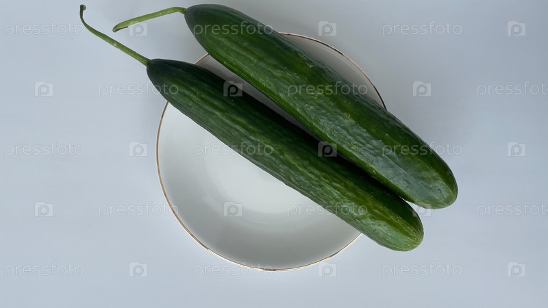 Свежие органические овощи в белой тарелке на светлом фоне. длинные зеленые огурцы создают здоровую, красочную композицию, идеально подходит для блогов еды, концепций здорового питания или вегетарианских рецептов. Идеален для продвижения фермера