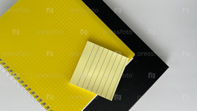 Современное рабочее пространство с желтой спиральной тетрадью, черной папкой и выложенными на чистом белом столе липкими листами.Минималистское расположение канцелярских принадлежностей, идеально подходит для производительности, организации и возврата